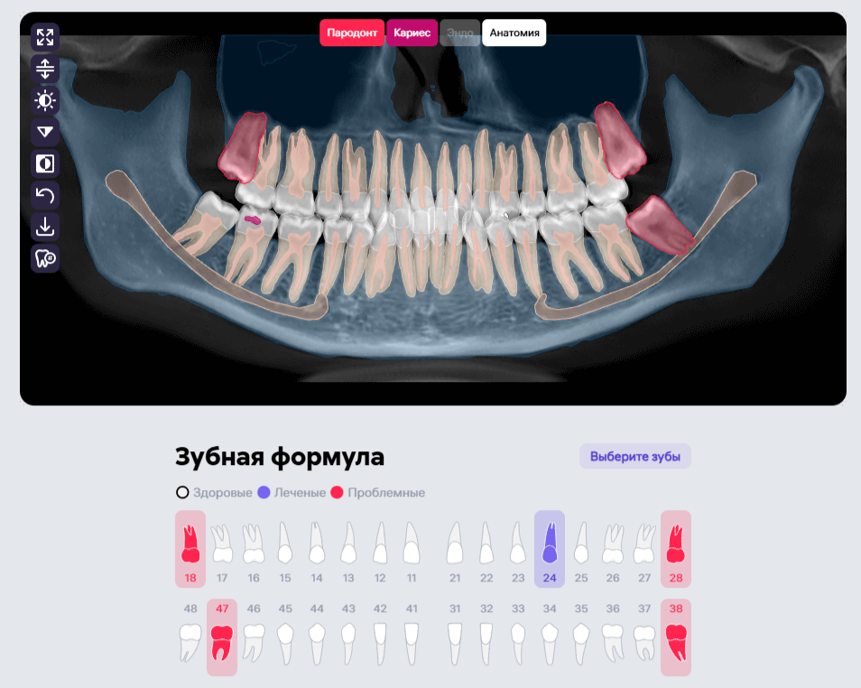 Врачу-стоматологу-терапевту алгоритм помогает выявить скрытые патологии, микроповреждения, заболевания на ранней стадии развития.